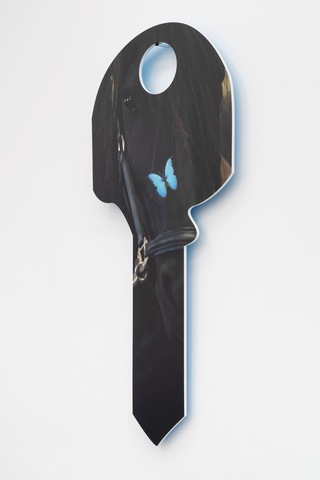 Wrong hole (using ketamine feminsim to foster derealisation), 2021 The initial work in the Master Key collaboration. The key cut-out, overlaid with a horse image from Lars von Trier’s Melancholia, establishes a critical interplay between the literal keyhole of a lock and the "k-hole," or dissociative state. This ambiguity acts as a material celebration of Mackenzie Wark’s concept of ketamine femmunism.